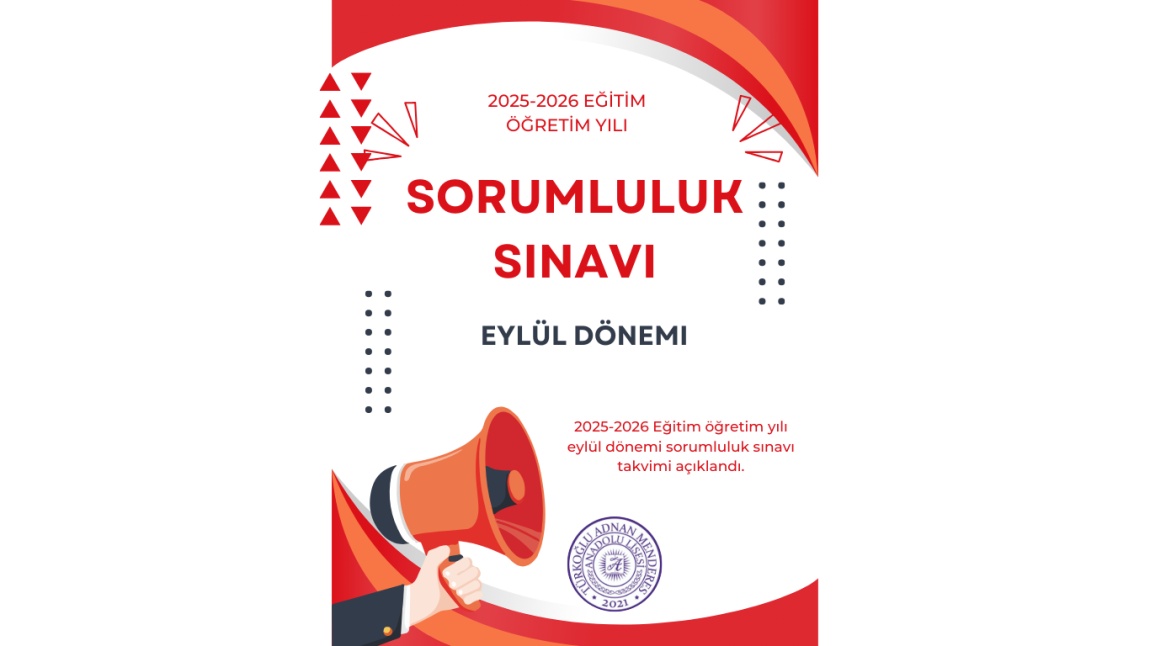 2025-2026 eğitim öğretim yılı Eylül Dönemi sorumluluk sınavı takvimi açıklandı. Sorumluluk sınavları belirtilen tarih ve saatlerde okulumuz Adnan Menderes Anadolu Lisesi'nde yapılacaktır. Aşağıdaki linle tıklayarak sınav takvimine ulaşabilirsiniz.
